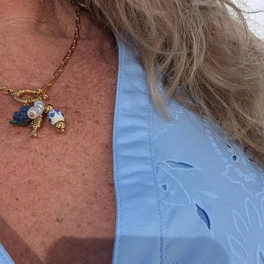 Gouden bedelketting met white eye hartjes bloempje zon en rode kraaltjes