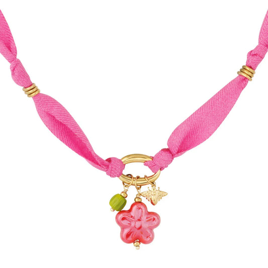 Roze ketting van stof met roze bloem gouden bijtje en groene kraal