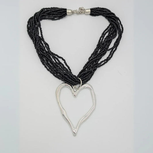 Multi ketting met kleine zwarte kraaltjes en groot zilveren hart