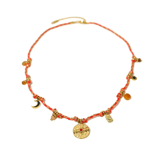 Oranje ketting van stof met goud bloem schelp en kraaltjes
