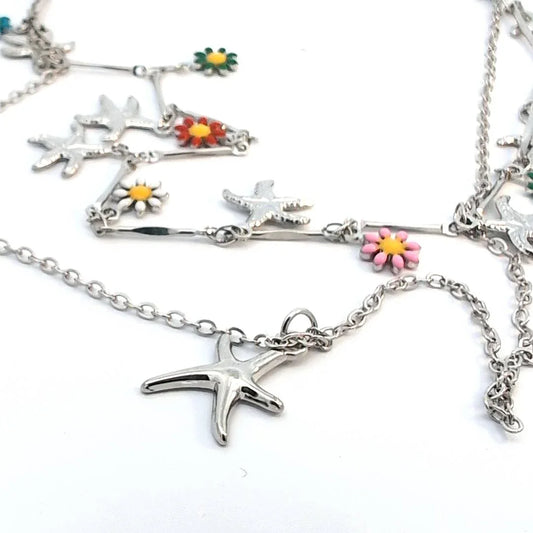 Fijne dubbele zilveren ketting met zeesterren en gekleurde bloemetjes