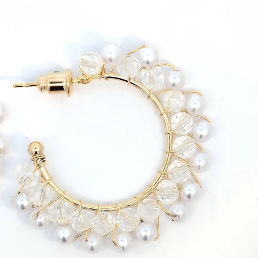 Oorringen goud met een dubbele rand van doorzichtige kraaltje en imitatie pareltjes