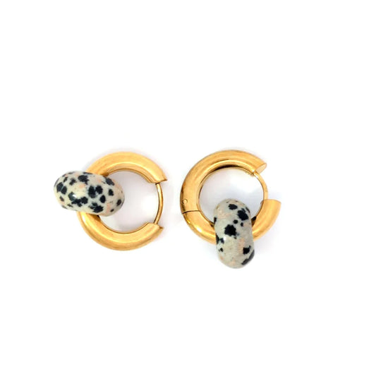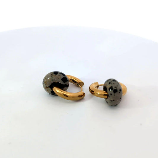 Gouden oorringen met donker grijs gevlekte natuursteen donut
