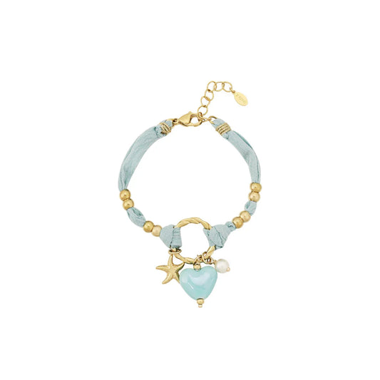 Licht blauwe armband van stof met blauw hart gouden zeester en parelkraaltje