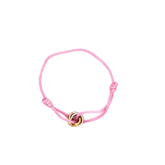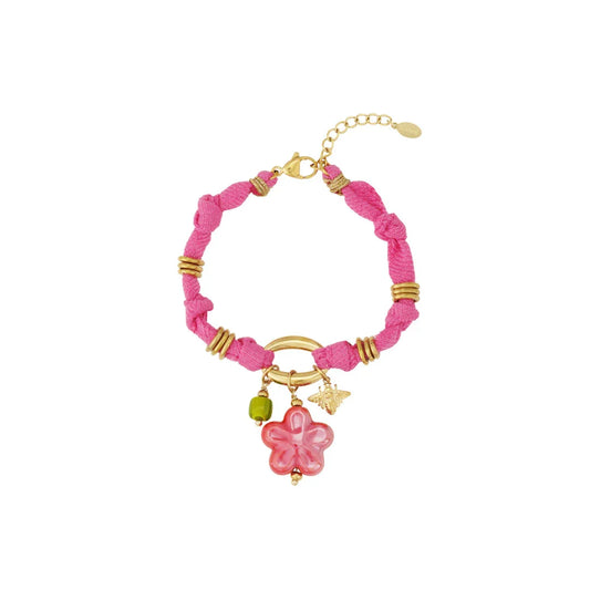 Roze armband van stof met roze bloem gouden bijtje en groene kraal