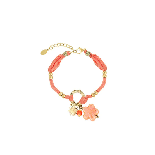 Oranje armband van stof met goud bloem schelp en kraaltjes