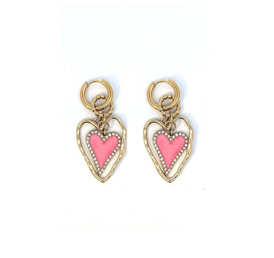 Oorringen goud met open hart bedel daarin hangt een roze hartje bedel afgezet met strass