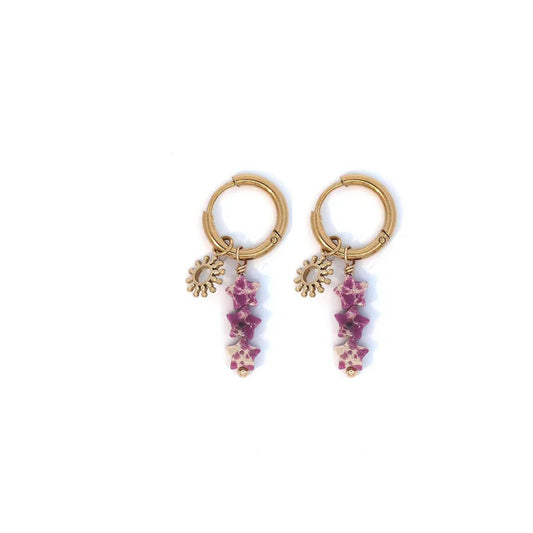 Oorringetjes met 2 hangertjes een open zonnetje en 3 paarse sterretjes