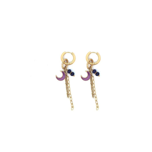 Oorringetjes goud met bedels halve paars maan en kettinkjes en blauwe kraaltjes
