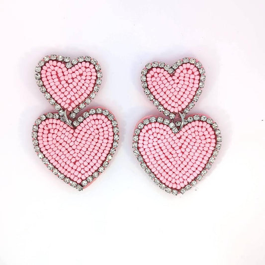 Oorknopjes met 2 hangende hartjes gemaakt van zacht roze kraaltjes afgezet met strass
