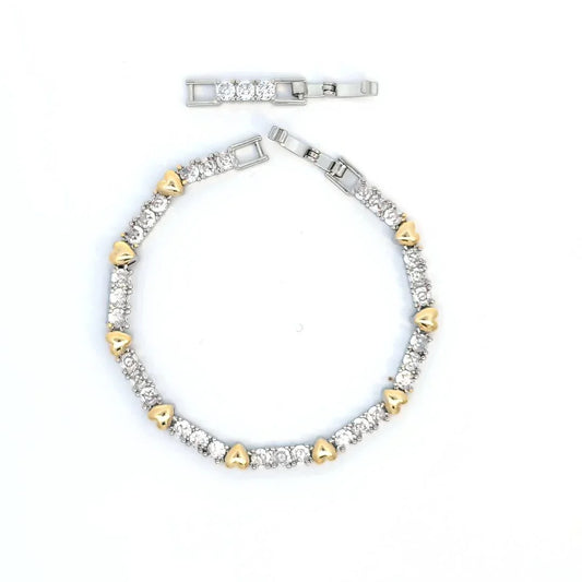 Zilveren armband met goud kleurige hartjes en zirkonen