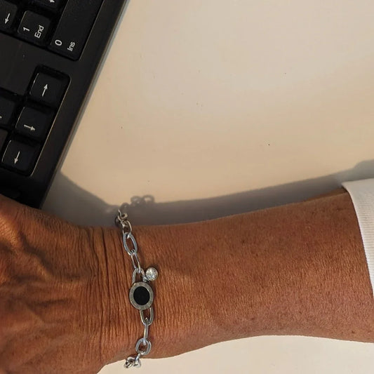 Zilveren armband met platte schakel met een loshangende kristal en een zwarte bedel