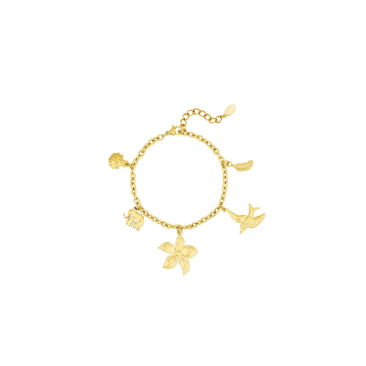 Setje gouden bedel ketting en armband met lieveheersbeestje olifant bloem vogel blad