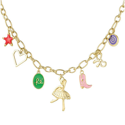 Setje gouden bedel ketting en armband bedeltjes ballerina cowboylaars hartje strikje