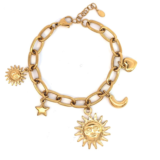 Setje gouden schakel ketting en armband met 5 bedels zon maan ster en hartje