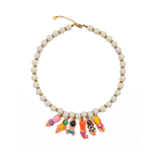 Binnen de Ibiza trend spelen kralensieraden een grote rol. Witte kralenkettingen zijn populair omdat ze zowel minimalistisch als opvallend kunnen zijn. En met een mooie bedel maak je de ketting ook persoonlijk.