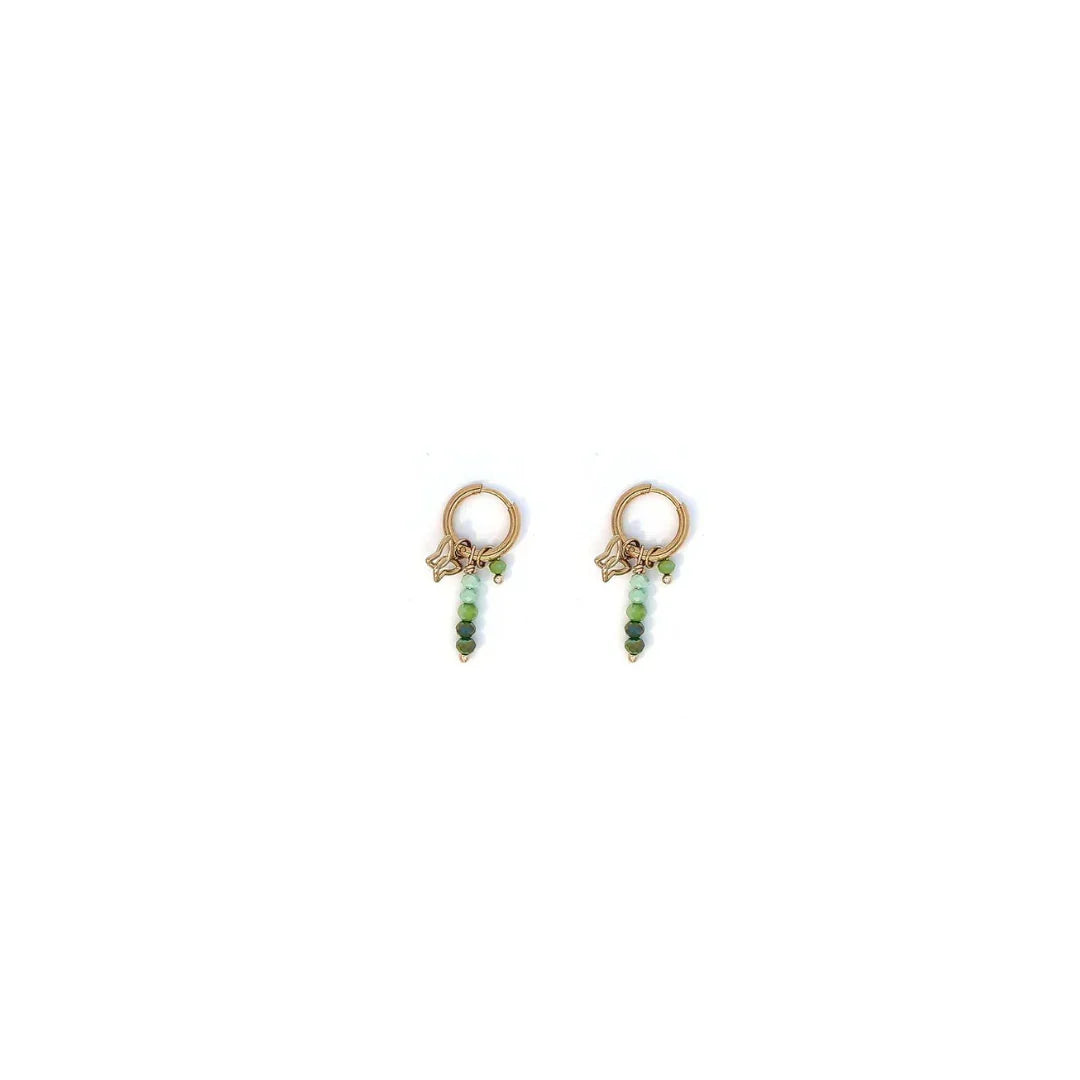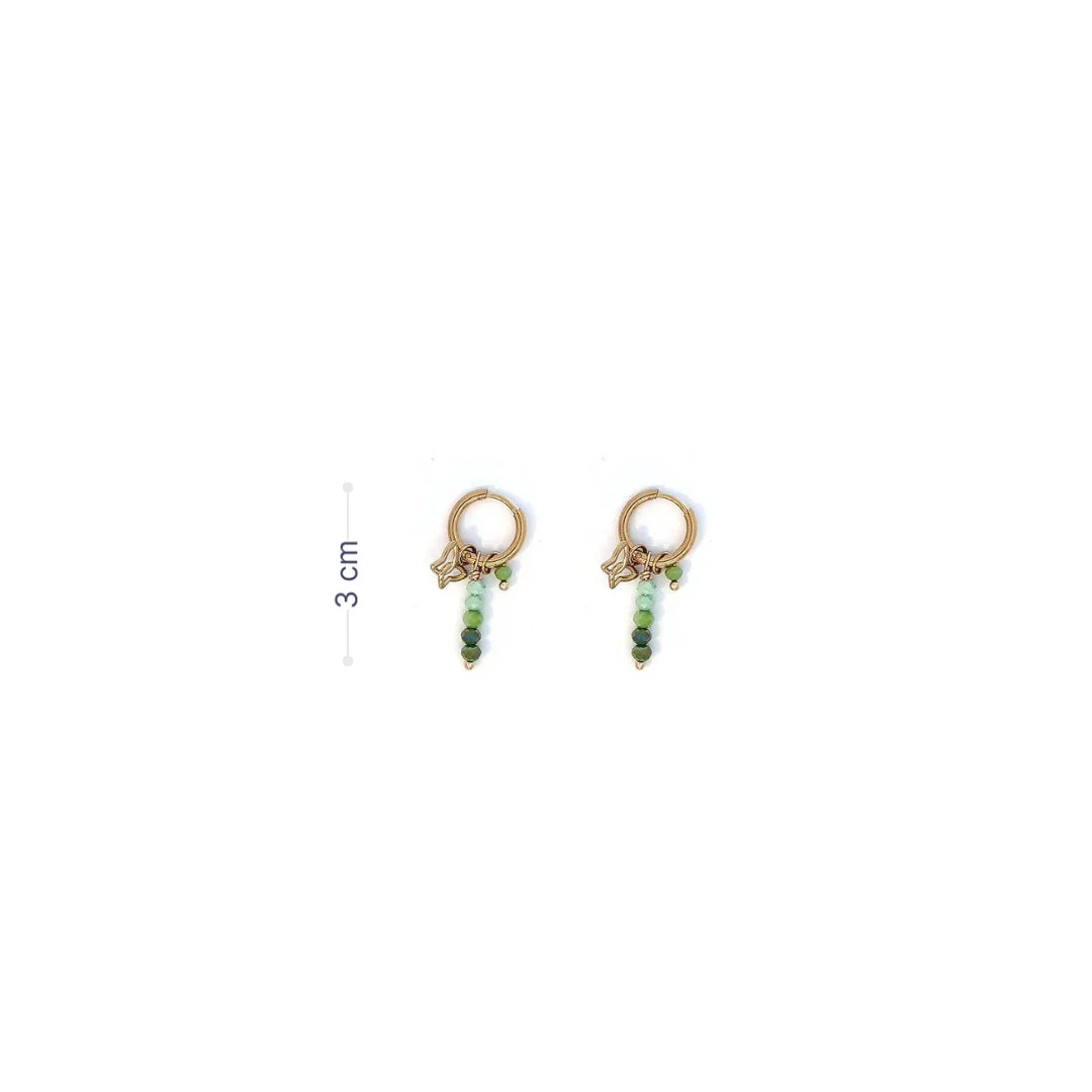 Oorringetjes goud met 3 hangertjes een vlindertje en groene kraaltjes
